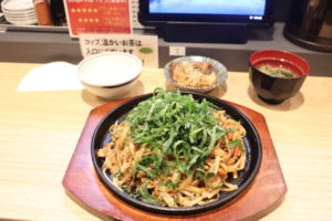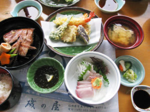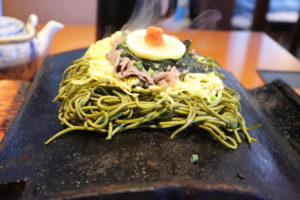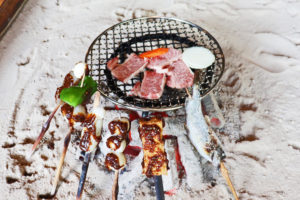 Kawara soba is a local cuisine which Soba noodles and meat are cooked together on a Kawara (stone roof tile) and dipped into a special sauce when eating it. |